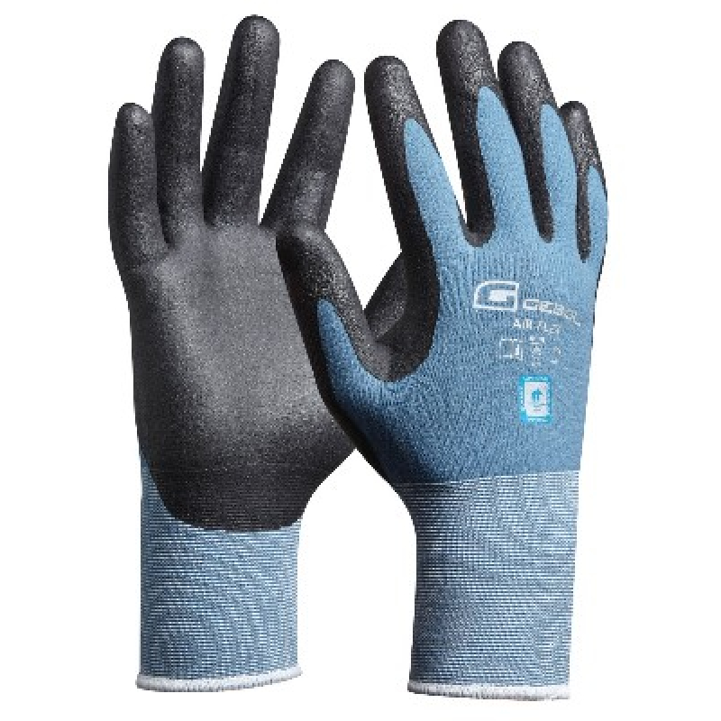 Pracovné rukavice Gebol Air Flex sú bezšvové montážne rukavice vyrobené z nylonu a elastanu s patentovanou nitrilovou TPR vrstvou, ktorá je dermatologicky testovaná a odpudzujúca olej. Vďaka špeciálnemu zloženiu materiálu Air Flex sľubuje extra dlhú životnosť a veľmi dobrý strih s vysokou priedušnosťou. Vďaka svojej optimálnej obratnosti a bezpečnému úchopu je Air Flex vhodný najmä na presnú prácu ako napr : Položenie podlahy.