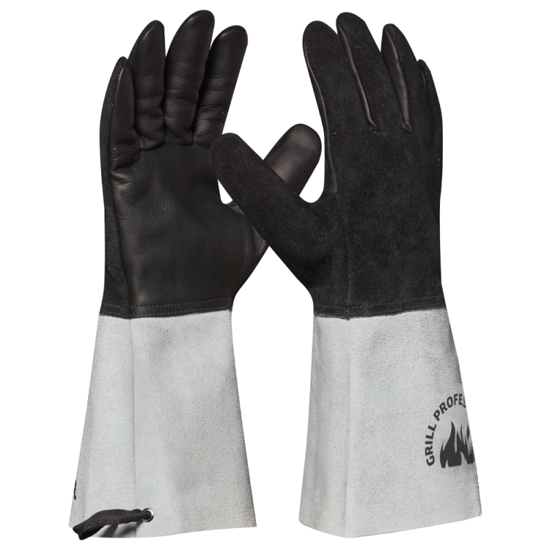 Grilovacia rukavica od špecialistu na bezpečnosť práce. Na prvý pohľad zaujme kombinácia farieb a druhov kože, ktorá je rovnako atraktívna ako aj funkčná: čierna nubuková koža na chrbte ruky v kombinácii s čiernou celozrnnou hovädzou kožou na dlani bohato zakrýva ruku. Dodatočnú ochranu poskytuje podšívka z kvalitného aramidového vlákna, ktoré používajú aj hasičské zbory. 14 cm dlhá nepodšitá manžeta zo svetlošedej nubukovej kože siaha po predlaktie a zároveň chráni pred odletujúcimi iskrami. Všetky švy sú vyrobené z tepelne odolného aramidového vlákna.