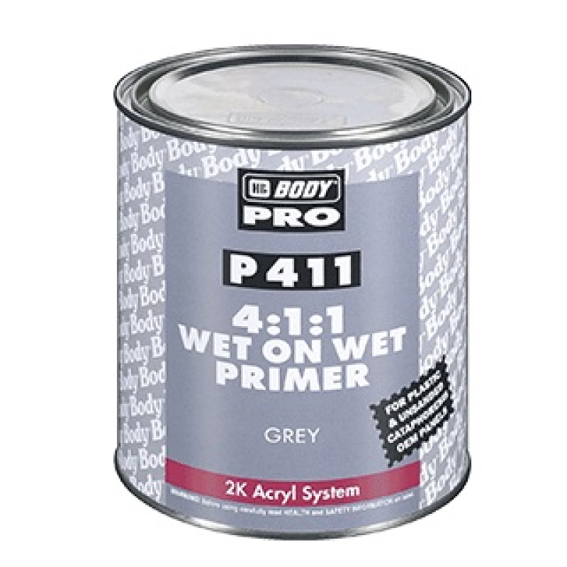 P411 4:1:1 WET ON WET PRIMER - plnič mokrý na mokrý Vysoko kvalitný akrylový tesniaci základný náter, ideálny pre aplikáciu „mokrý na mokrý“ na všetky kovy O.E.M. (E-COAT) kataforézne panely, plastové nárazníky a ich časti. Pomer tuženia 4: 1 s tužidlom H 729 pre plniče NORMAL. Jednoduché použitie s vynikajúcou konečnou povrchovou úpravou. Vyžaduje jeden náter (15 - 20μm), rýchlo schne a môže byť znova nanášaný do 20 - 30 minút. Odtieň: čierny, šedý, biely